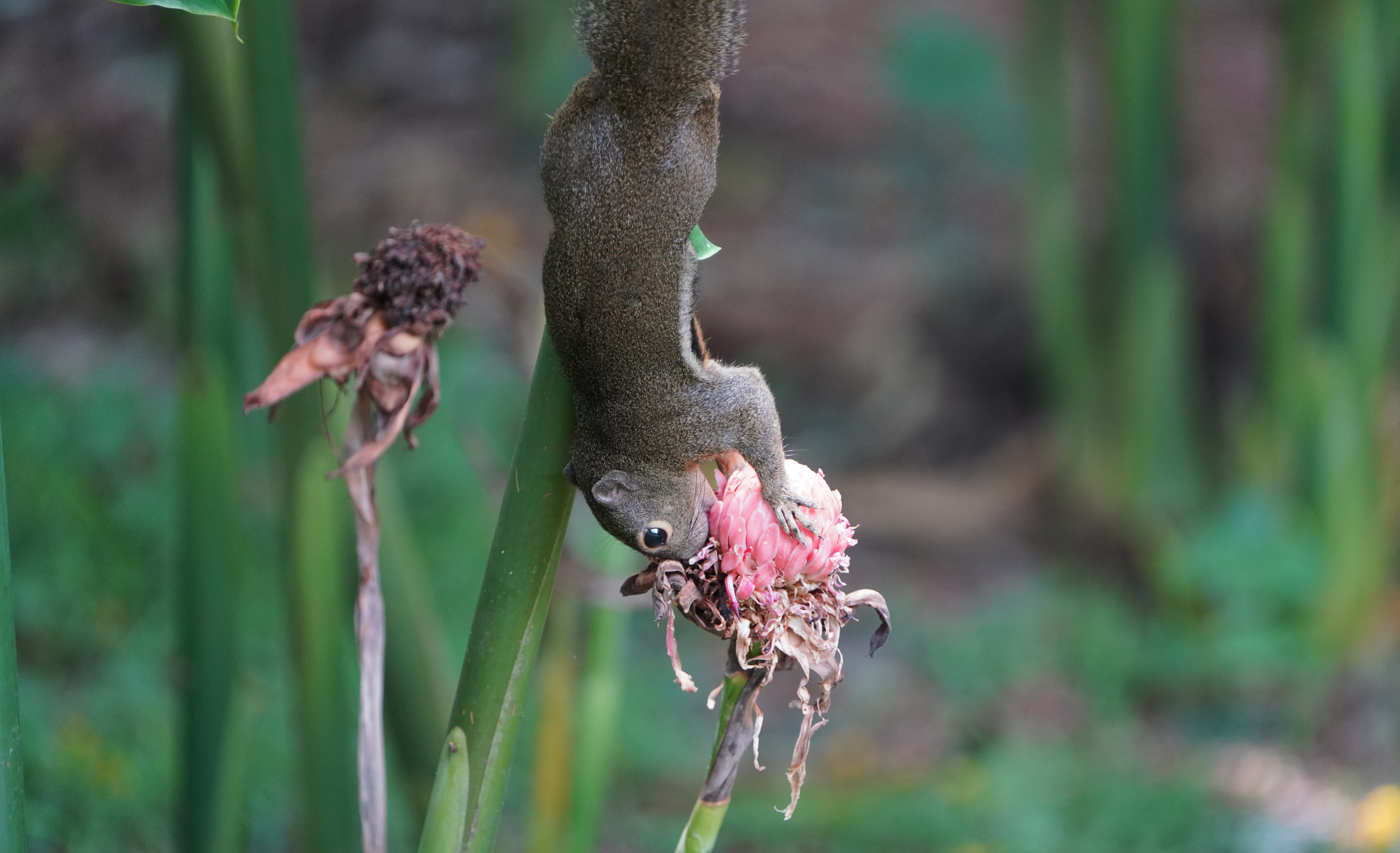 Der Vogel sitzt neben Hütte, die zugemüllt am Hang des Berges der Insel steht. Ich klettere an einer anderen Stelle (beim kleinen, roten buddhistischen Schrein) auf den Berg. Dort befindet sich ein alter Baum in einem Urwald.