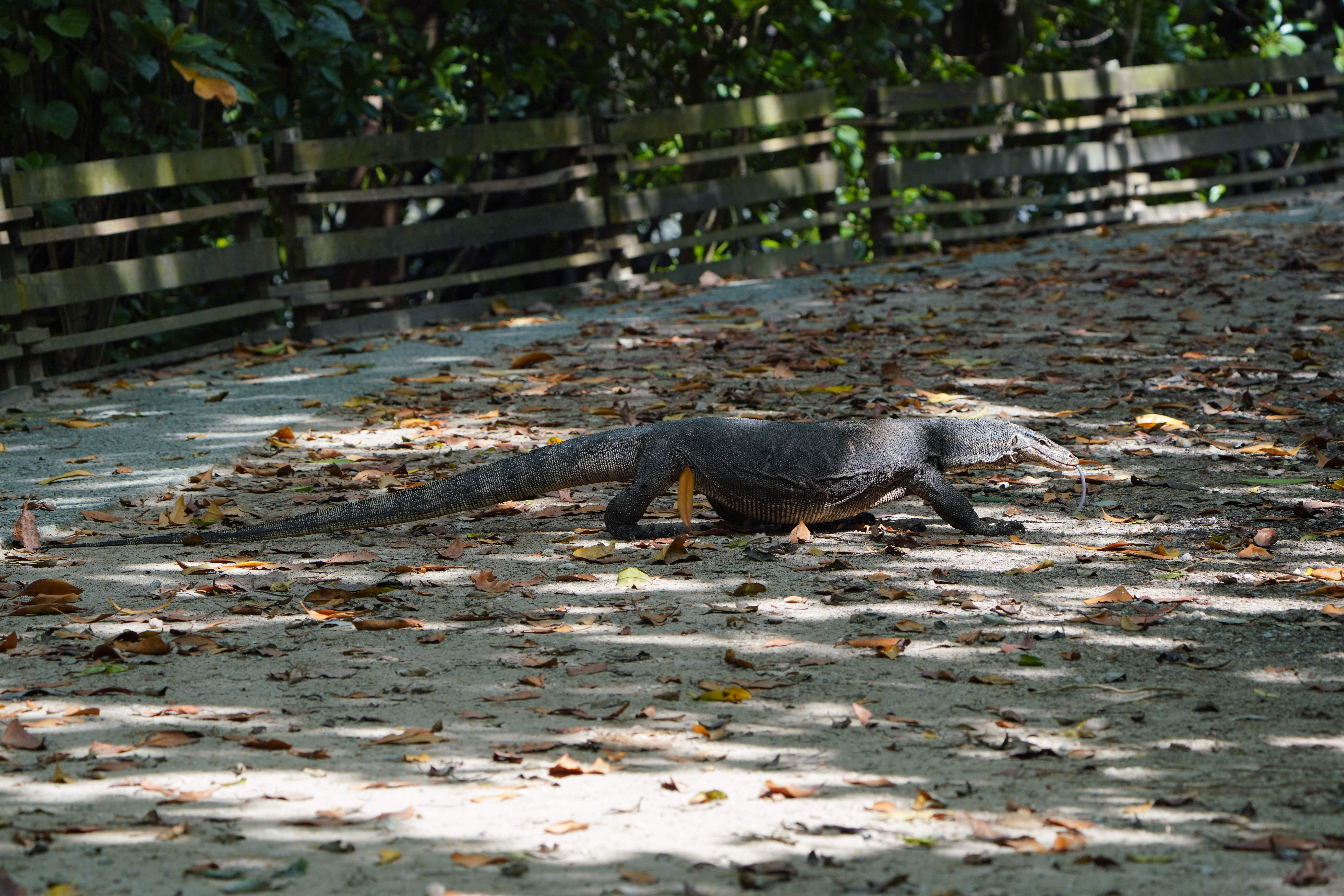 Weiter auf dem Weg sitzen drei Tiere auf dem Weg: zuerst ein kleiner Bindenwaren mitten auf dem Weg liegend, dann ein großer Bindenwaran den Weg querend und zuletzt ein Otter, ebenfalls den Weg querend. Bevor ich realisiert habe, dass es ein Otter ist, ist der aber schon wieder weg.