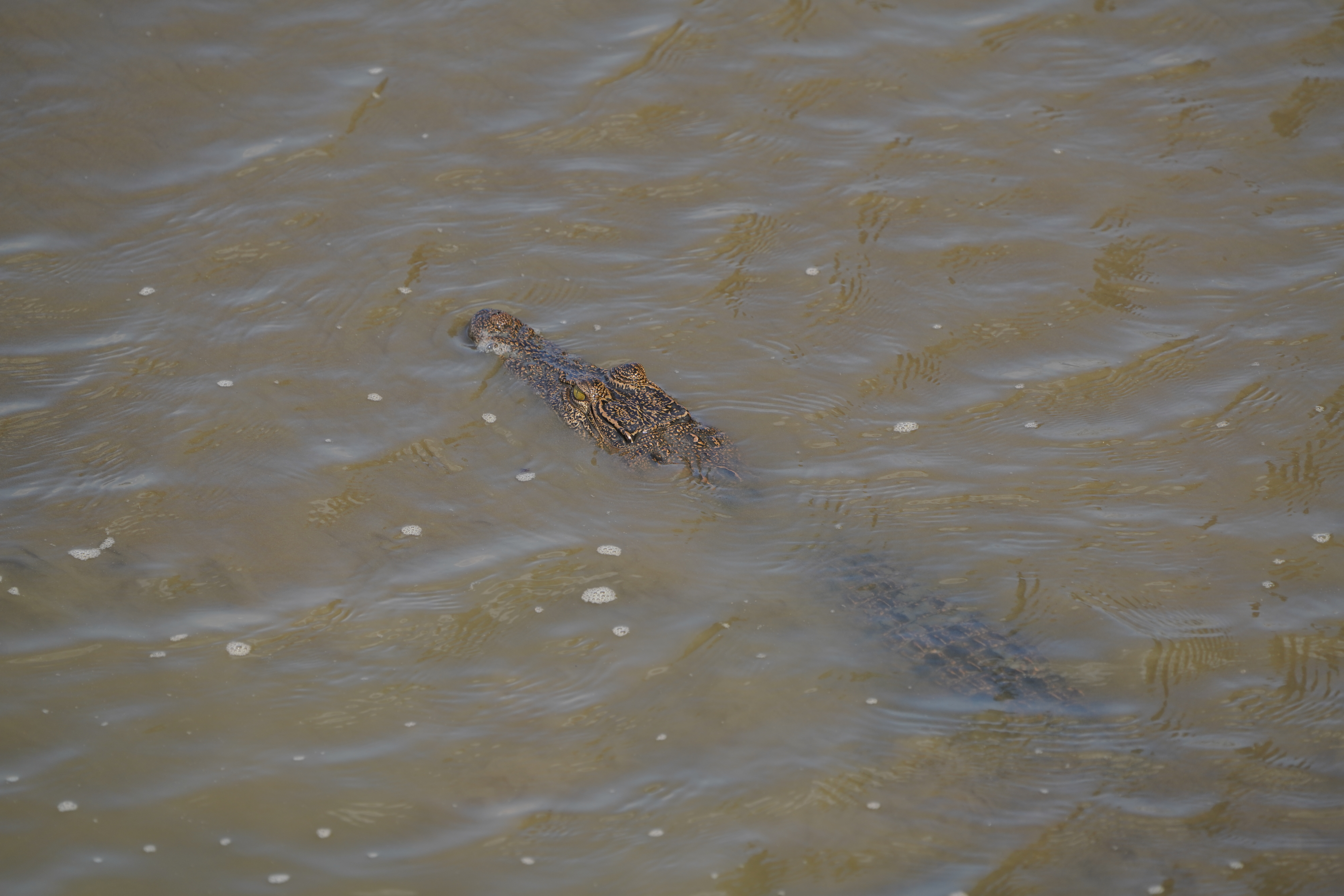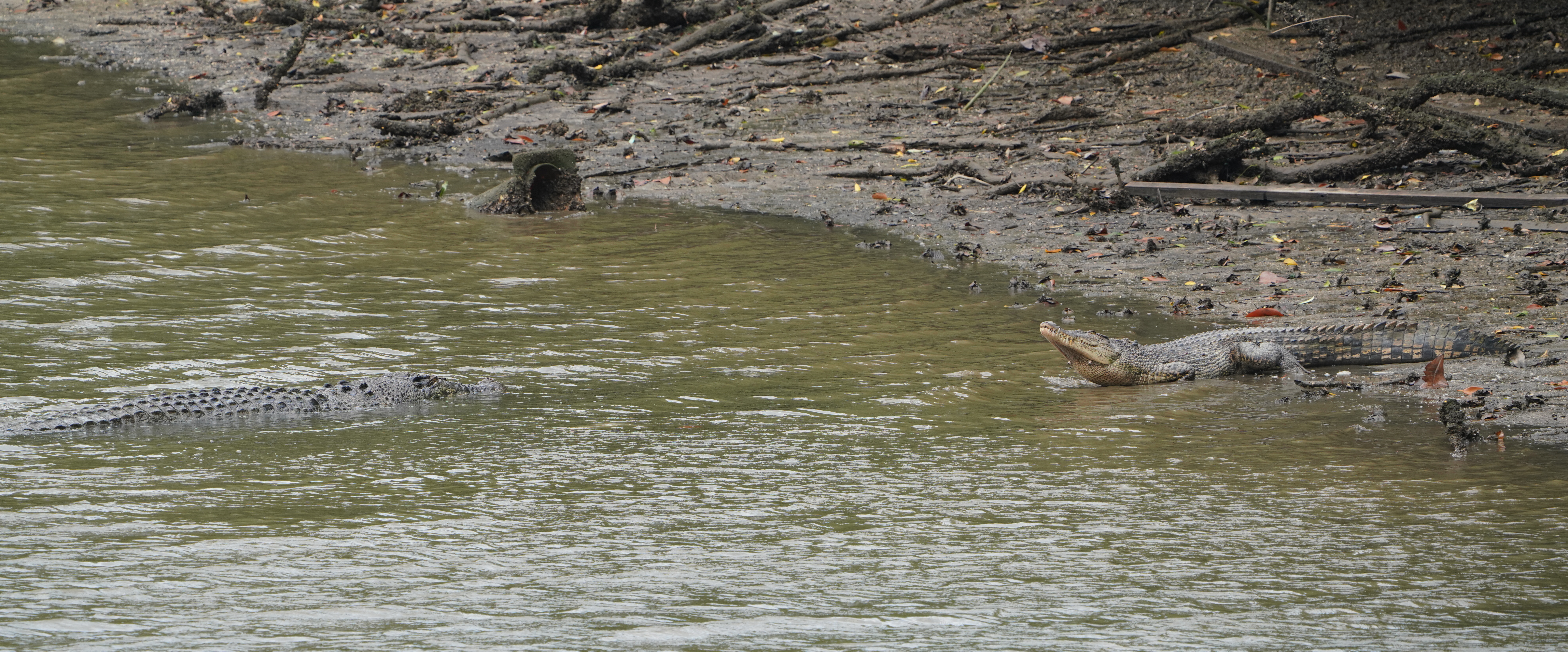 Ich frage die beiden Männer, die die Königskobra beobachten, ob es hier Krokodile gebe. Schilder weisen ständig darauf hin. Sie meinen ich soll bei der Main Bridge mal gucken. Gesagt, getan. Am Ufer liegt ein Salzwasserkrokodil (Leistenkrokodil). Als ich es fotografiere, schwimmt gerade ein weiteren den Fluss entlang. Das am Ufer liegende Krokodil bewegt sich daraufhin Richtung Fluss. Ich erwarte einen Kampf, es passiert aber nichts. Das am Ufer liegende Krokodil hatte davor auch schon einen vorbeigehenden Seidenreiher ignoriert.