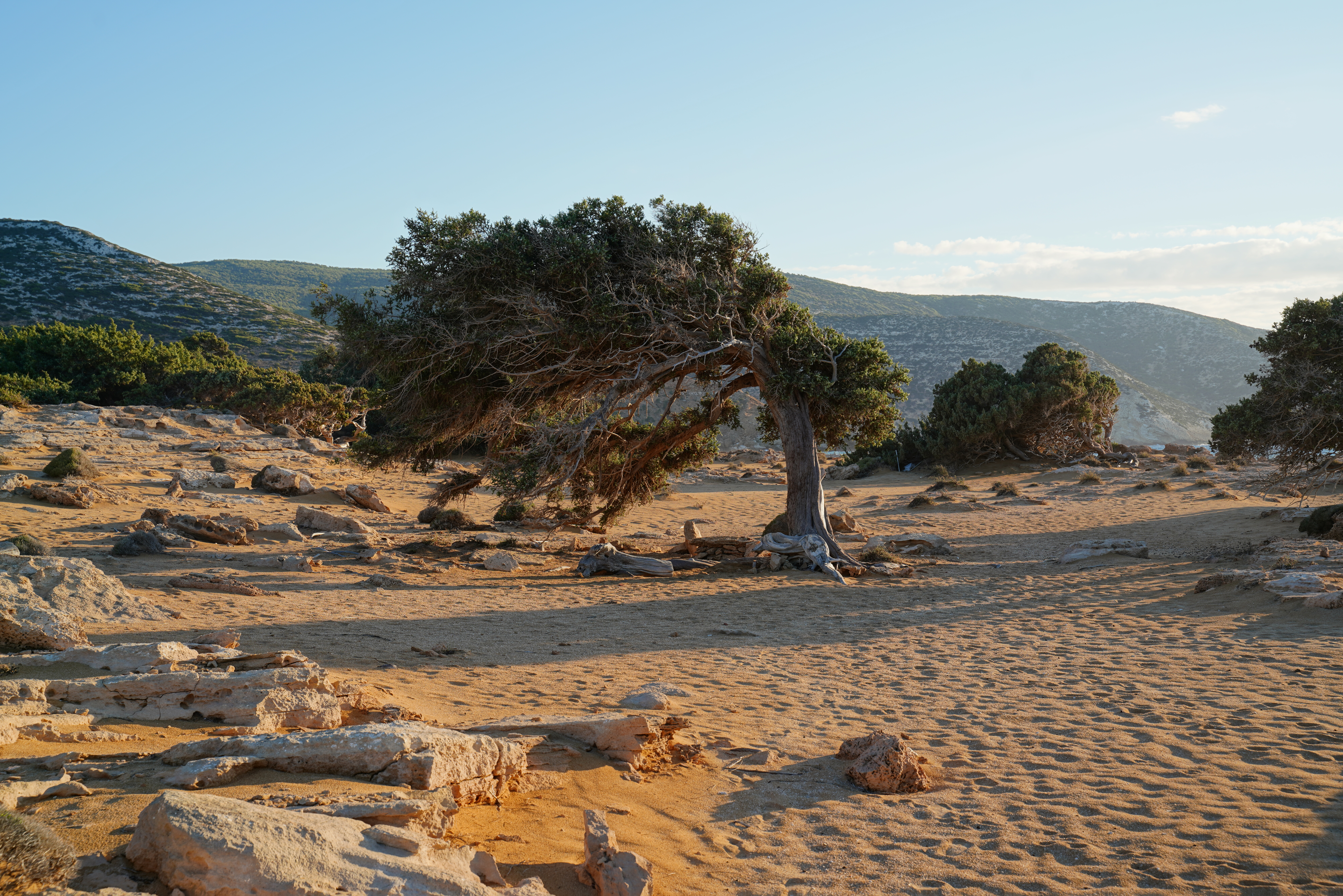 An diesen Stränden befinden sich uralte Zedern und zahlreiche Behausungen von Aussteigern: viele Wacholder und selbstgebautete Hütten. Das erinnert mich an Chrysí.